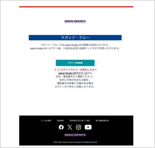 ラガッツ・クルー公式Webサイト、ファンクラブページより「マイページログイン」ボタンをクリックしてください。