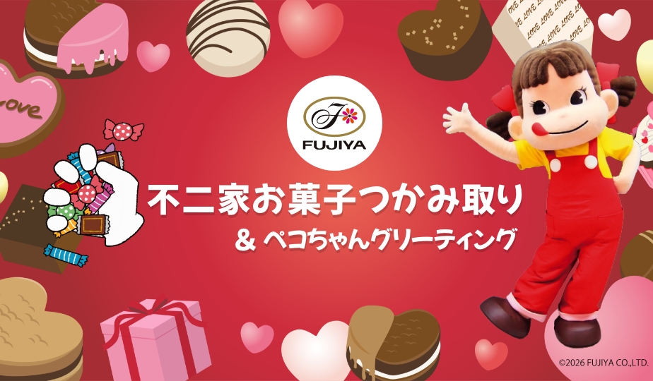 MATCHDAY SPONSORの不二家による、「お菓子のつかみ取り」と「ペコちゃんグリーティング」を場外広場で実施します。